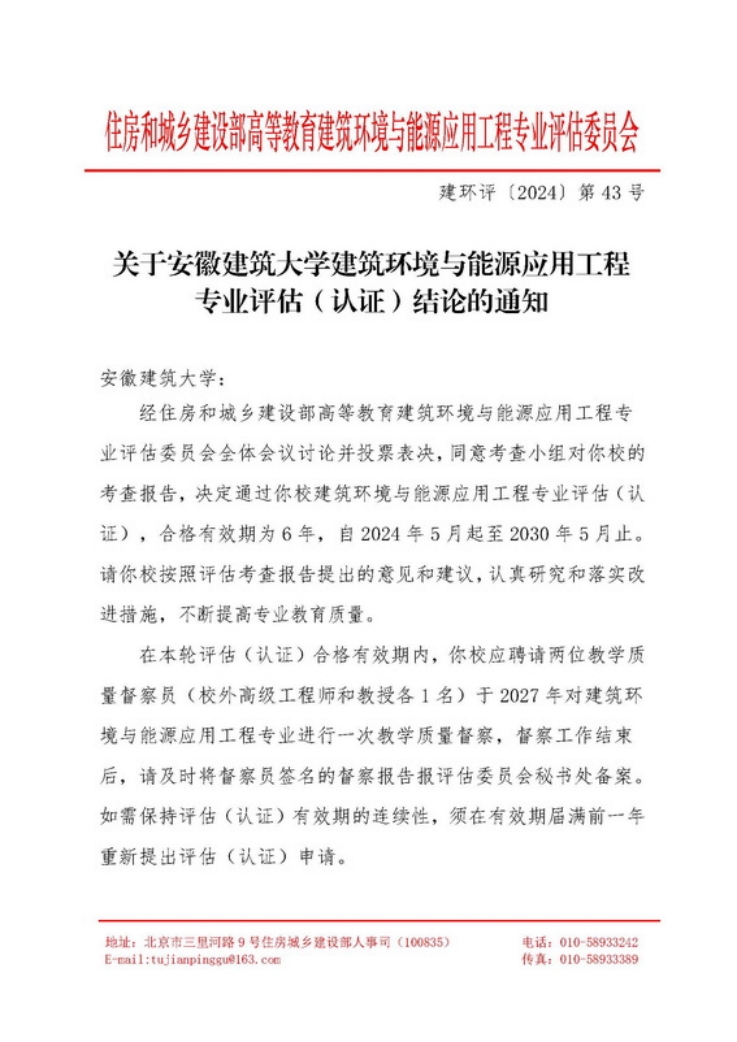 本网讯 6月26日,根据住房和城乡建设部高等教育建筑环境与能源应用工程专业评估委员发布的《关于安徽建筑大学建筑环境与能源应用工程专业评估(认证)结论的通知》(建环评〔2024〕第43 号),安徽建筑大学建筑环境与能源应用工程专业顺利通过专业评估(认证),合格有效期为6年,自2024年5月起至2030年5月止。