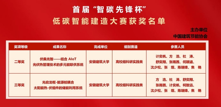 本网讯 近日,由中国建筑节能协会主办的首届“智碳先锋杯”低碳智能建造大赛获奖名单正式公布,环境与能源工程学院师生自主申报的两项科研实践类(高校组)项目荣获大赛二等奖和三等奖各一项,为安徽省唯一获奖的高校组参赛团队。
