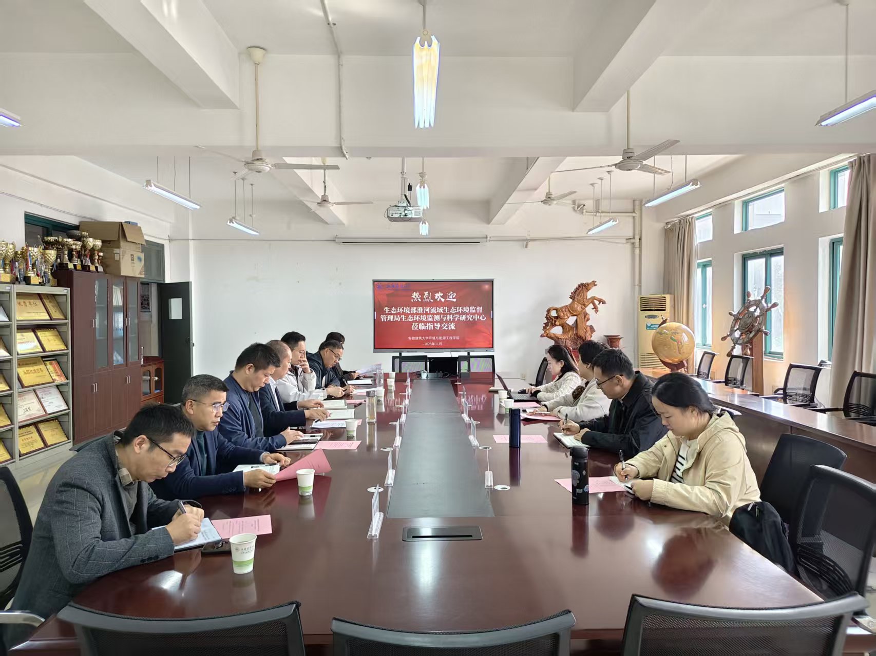 谢发之院长首先代表学院对郁丹英主任一行的到来表示热烈欢迎,并系统介绍了环境与能源工程学院的发展历程、学科特色、科研优势。他指出,学院深耕环境与能源领域数十年,在市政工程、环境工程等学科形成稳定研究方向,尤其在数智化治水、水生态修复等技术领域成果丰硕,曾先后承担淮河、巢湖等流域水污染治理相关重大纵横向课题50余项,为区域生态环境保护作出积极贡献。学院拥有完善的实验教学体系和一支高素质师资队伍,具备与淮河流域局监测与科研中心开展深度合作的坚实基础。