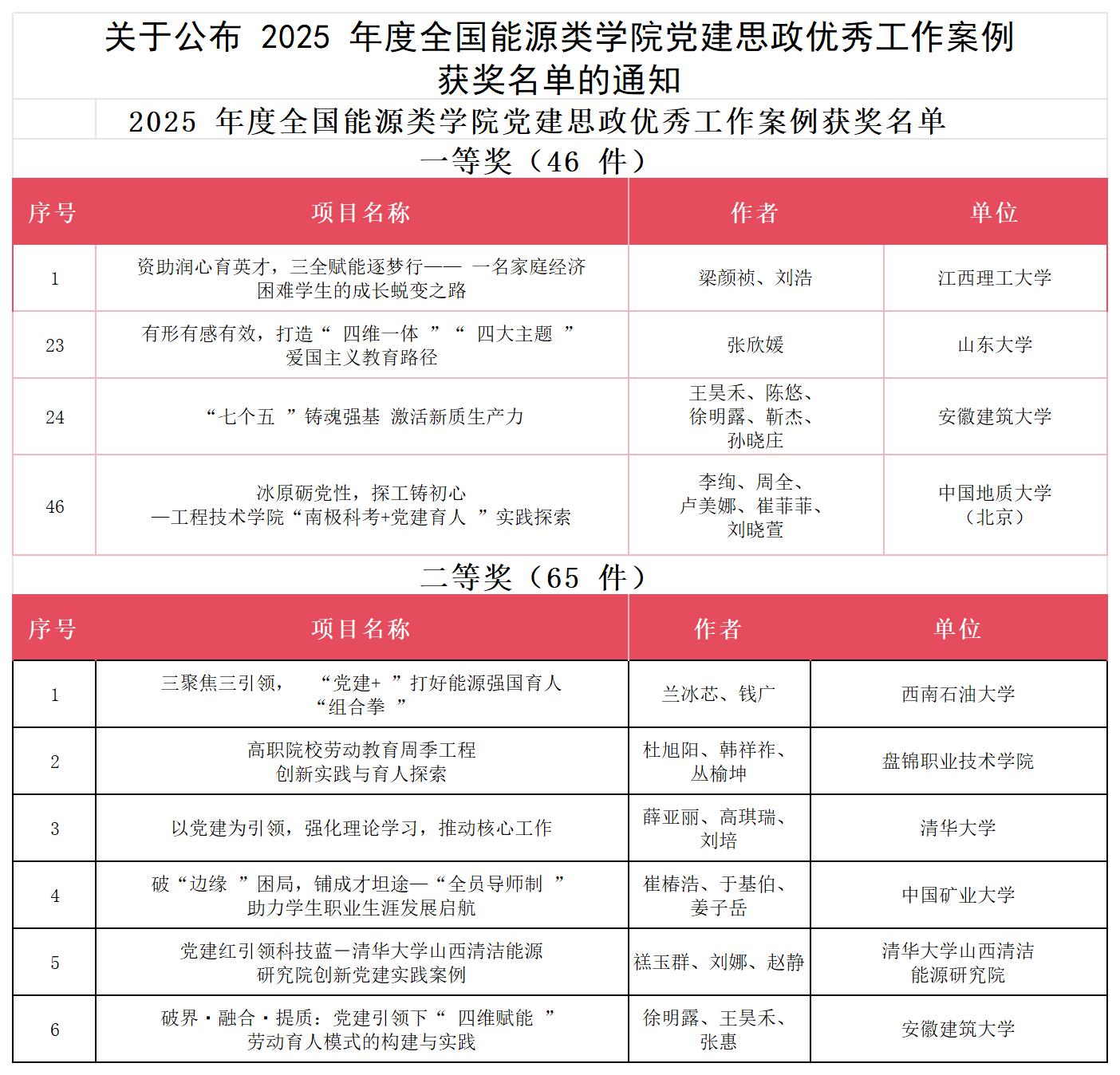 环能学院申报的案例和撰写的论文凭借鲜明的能源学科特色、创新的育人思路与扎实的实践成效,从全国众多参评作品中脱颖而出,成功斩获优秀工作案例一等奖1项、二等奖1项;优秀论文一等奖2项、二等奖3项、三等奖1项。既是对环能学院学工队伍围绕学生成长需求、结合能源领域人才培养目标开展思政实践工作的高度认可,也体现了学院党建工作与思政育人实践深度融合的良好态势。也展现了环能学院学工队伍在党建思政理论研究领域的深厚功底与创新能力,为学院进一步优化思政育人策略、提升思政工作科学化水平提供了有力支撑。