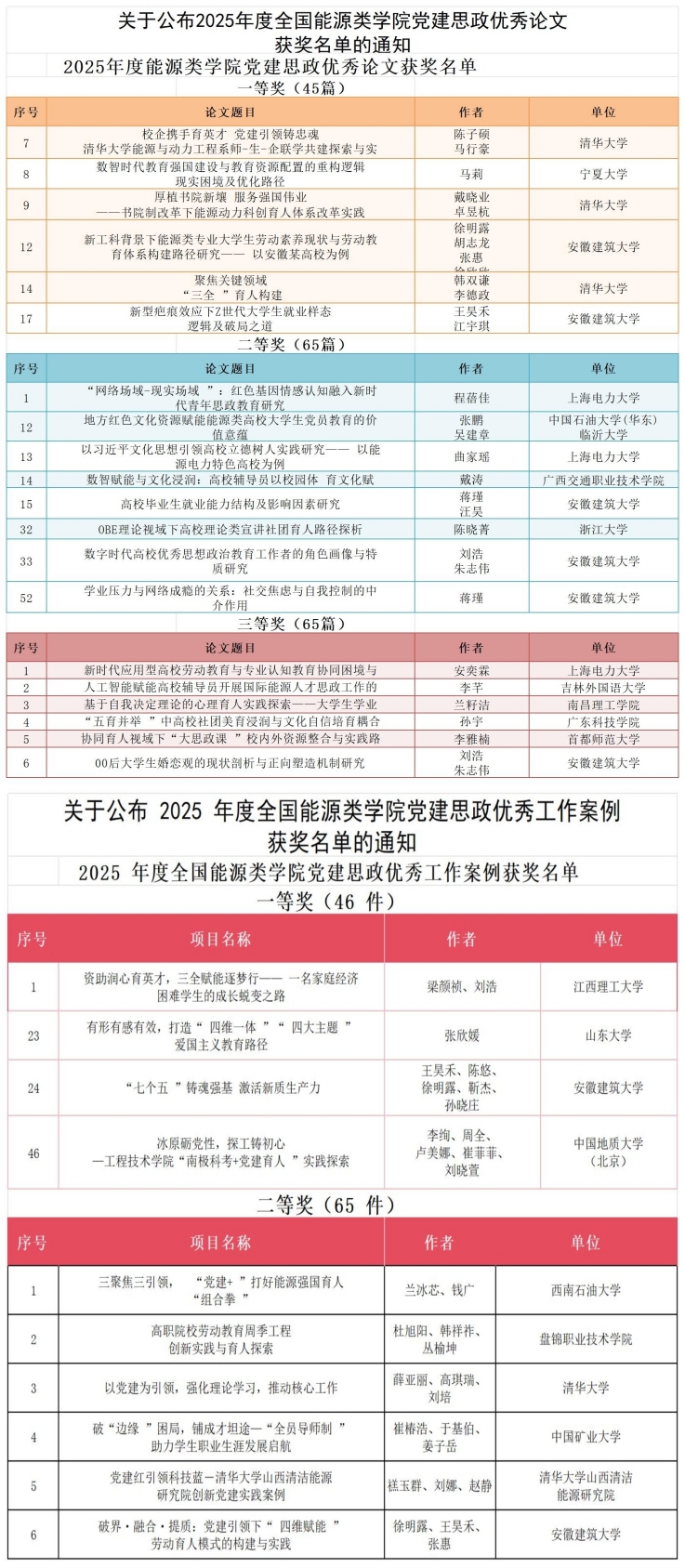 党建品牌建设成效显著。2022年学院党委获批安徽省首批“全省党建工作标杆院系”,学院多次斩获校“宣传工作先进单位”“校园十佳网站”“优秀微信公众号”“就业工作先进单位”“学校先进基层党组织”等荣誉称号。学院基层党支部建设成果丰硕,先后有5个党支部获校级“先进基层党组织”称号,2个党支部成为省级“双创”样板党支部,3个党支部成为学校“双创”样板党支部,1个教师党支部通过校级首批“双带头人”教师党支部书记工作室验收,1个教师党支部获批校“双带头人”教师党支部书记工作室建设单位,且所有党支部连续3年在学校党支部标准化建设验收中实现100%达标。撰写的党建工作案例获全国高校思想政治工作创新发展论坛优秀工作案例、安徽省基层思想政治工作优秀创新案例、全国能源类学院党建思政优秀工作案例一等奖1项、二等奖1项;撰写的党建论文获全国能源类学院党建思政优秀论文一等奖3项、二等奖3项、三等奖1项。党建工作成为学院发展的鲜明特色。