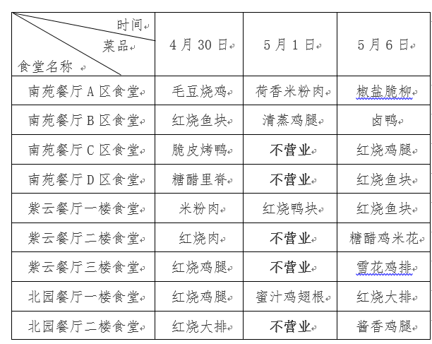 上述食堂自:5月1日-5月4日停止营业,5月5日中餐恢复正常营业。