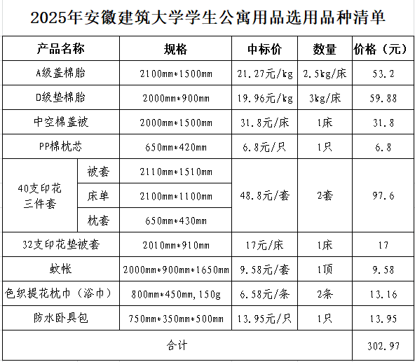 (二)为了2025级新生采购到质优价廉的学生公寓用品,学校参加了“2025年部分高校学生公寓用品联采”的集采项目,委托的招标代理机构为鼎信数智技术集团股份有限公司,本项目于7月12日开标,学校已按照品类选定供应商。委托采购的学生公寓用品按套售卖,所含商品及价格如下: