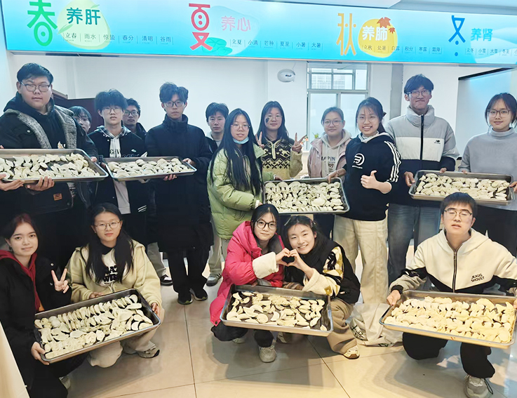活动伊始,食堂工作人员已提前备好饺子皮、馅料以及饺子盘等各类工具,将大厅布置得整洁有序。同学们有序分组围站桌边,在工作人员的手把手指导下迅速投入活动——工作人员细致讲解包馅、捏褶技巧与馅料用量把控要点,亲自示范多样包法,助力新手快速上手。现场氛围热烈温馨,同学们热情高涨、分工协作,小心翼翼地完成包馅、捏合步骤,包出的饺子形态各异却饱含用心;工作人员穿梭其间答疑帮扶、互动交流,欢声笑语中满是饺香与温情。