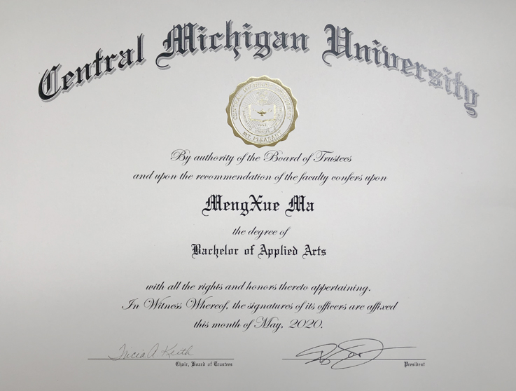 本网讯 我校与美国中密歇根大学合作举办的环境设计专业本科教育项目学生马梦雪,于2020年5月获得了美国中密歇根大学应用艺术学士学位证书,这是我校与美国中密歇根大学合作办学项目首位取得美国学士学位的学生。