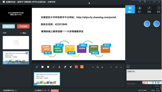 汤伦老师借助超星学习通直播平台跟大家分享了“超星学习通授课+多平台在线互动”线上教学模式,通过超星学习通“六步教学法”、多平台在线互动的使用、心得分享三个方面展开。首先详细的图文解说了创建课程、导入资料(EV录屏)、在线学习、设置作业、互动答疑、督导督学的在线教学流程;其次指出在充分把控课堂节奏之外,利用超星学习通EV录屏/直播+课程QQ群/微信群,QQ群语音通话、屏幕共享,设置主题讨论等多种方式配合,加强与学生的互动和交流;最后通过多种线上教学平台结合、增加互动性的练习,引导学生思考和互动、熟练操作平台,及时督导督学并反馈学习效果三个方面进行了分享。