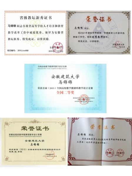 马老师潜心教学研究,总结教学中所获得的创新经验,不断提高教育教学质量,积极参加各项教学技能与创新比赛,在安徽省首届高校数学微课程教学竞赛中获得特等奖,首届全国高校数学微课程教学设计竞赛中获二等奖,安徽省第三届普通高校青年教师教学竞赛中获三等奖,学校的各类教学技能和创新比赛中也曾多次获奖,同时获批省级和校级质量工程项目多项。于2015年获得“安徽省教坛新秀”称号,并于2021年被评为“安徽建筑大学优秀教师”。在这些比赛中更好地与省内外同行交流学习,将所得经验进一步用于教育教学与改革创新中。