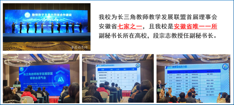 3、2024年12月,我校成为长三角教师教学发展联盟首届理事会七家安徽省高校理事单位之一,且我校是安徽省唯一一所副秘书长所在高校,段宗志教授任副秘书长。