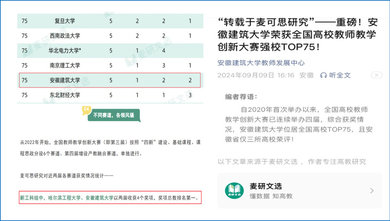 4、9月份,据麦可思研究机构微信公众号公开信息,自2020年,全国高校教师教学创新大赛已连续举办四届,综合获奖情况,安徽建筑大学位居全国高校TOP75,安徽省仅三所高校荣评。