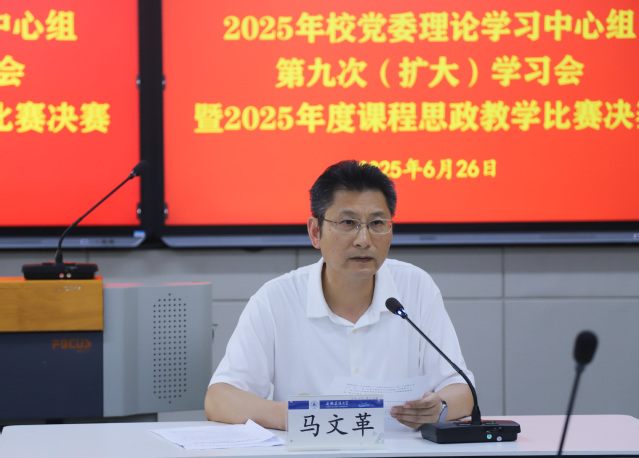 6月26日下午,学校召开党委理论学习中心组第九次(扩大)学习会,隆重举行课程思政教学比赛决赛。校党委书记马文革主持会议,校党委理论学习中心组全体成员担任评委,各学院党政负责人、教学副院长及教师代表全程观摩。