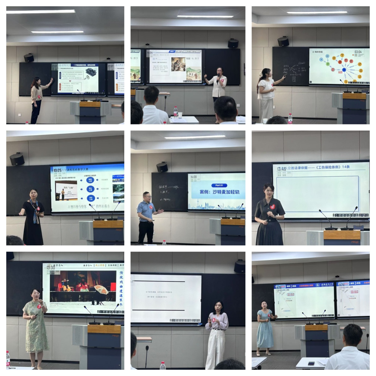 比赛自4月下旬启动以来,各教学单位积极响应,以专业系(教研室)为单位组织初赛,将课程思政比赛作为教学组织开展教研教改活动的重要内容进行观摩学习,通过比赛实现人人受教育,层层选拔优秀参赛教师代表。5月下旬全校各教学单位完成初赛评审,共推荐51名教师晋级校级预决赛。6月20日,教师发展中心组织校级预决赛,分三组同步进行,邀请15位校内外专家担任评委,从课程设计和现场教学展示两个维度进行综合评价。经过激烈角逐,每组前三名共9位教师晋级决赛。参赛选手充分展现了课程思政建设专业素养与创新意识,通过比赛和教学观摩,广大教师对课程思政资源建设更加重视,对课程思政教学更加投入,课程思政元素有机融入课堂教学,全面彰显课程思政育人成效。