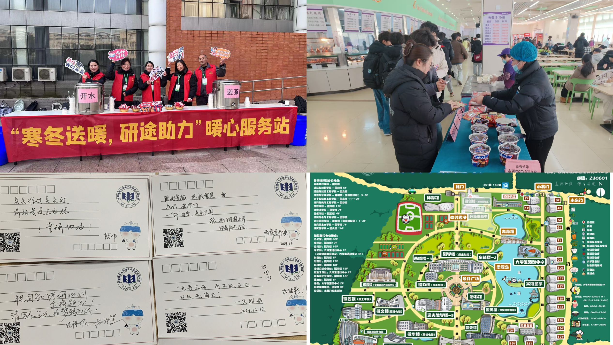 学校各部门、各学院积极践行“研考精神”,紧密锚定考生需求,开展多元化暖心服务。后勤处精心组织开展“寒冬送暖,‘食’力助考”等系列暖心服务举措,向全体考生提供免费早餐和冬至节令餐饮,发放免费午餐券,赠送文具、保暖手套、围巾、水果等备考“加油包”,在各考区提供姜茶、能量食品,为考生加油鼓劲;呼应考生反馈,设置午间休息室,增加考场空调开放时间,设立研考专用绿色窗口方便各校区入校考生就餐、休息。学生处、各学院举行考前动员会、学生座谈会、宿舍走访等形式多样的活动,为考生减压赋能。各学院开展各具特色的考前送祝福、发放大礼包等暖心活动,金寨路校区各学院开通送考专车,建规学院教师连夜加班为入校考生设计专用地图。全校教职工用心用情优化服务,为考生提供温馨舒适的考试环境。