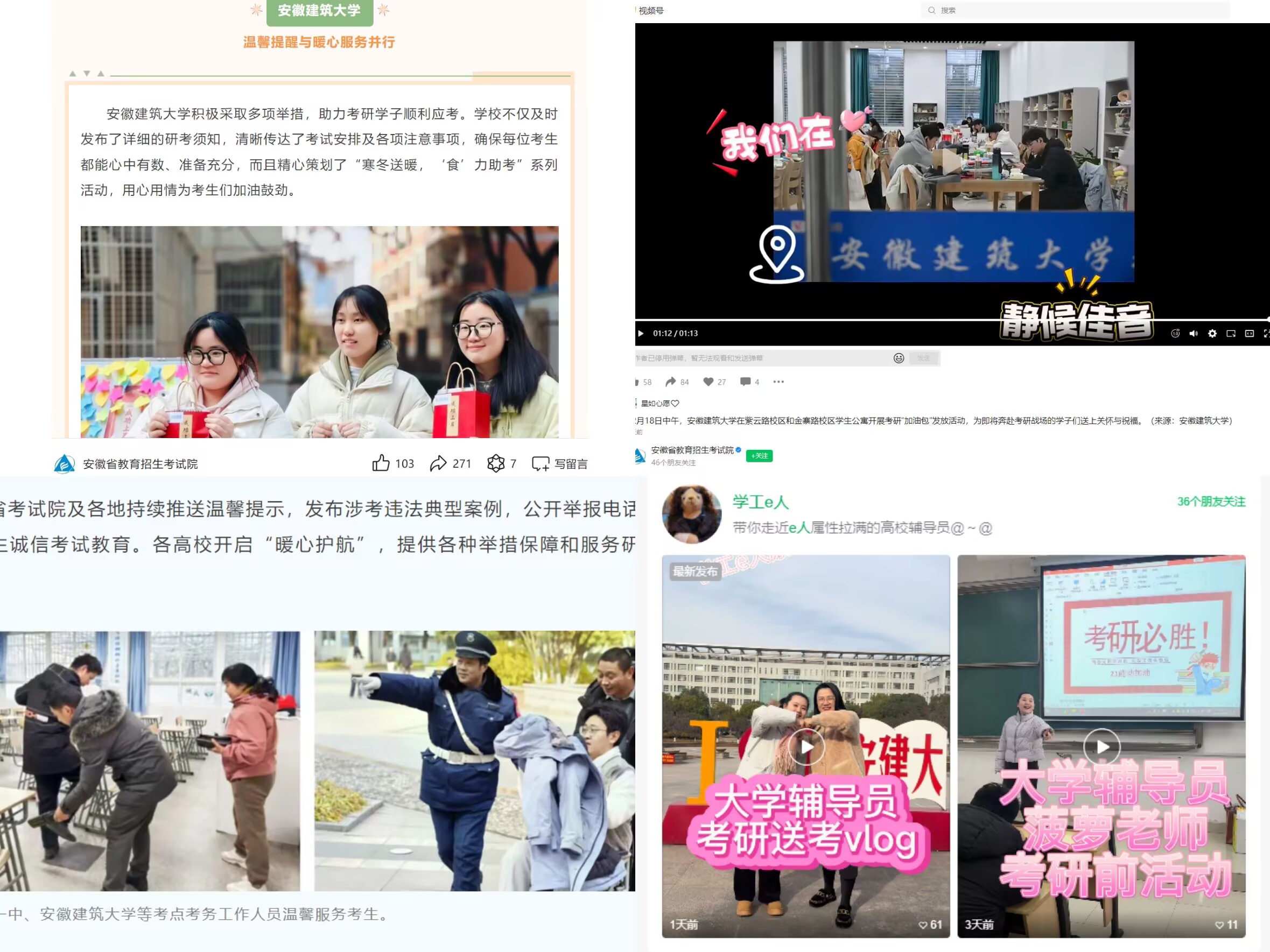 考试期间,各单位积极开展新闻、推文、视频等丰富多样的宣传报道,为考生提振士气,向社会宣传安建大考风学风教风。我校研考推文获省考试院公众号首批发布,研考视频获省考试院视频号专题推送,是省内高校中唯一一家。截至目前,学校研考工作已三次获省级教育主管部门宣传报道,在全省展示安徽建筑大学师生风采和办学质量。