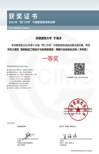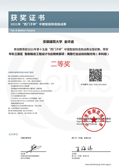本网讯 近日,由安徽省教育厅,教育部高等学校自动化类专业教学指导委员会、西门子(中国)有限公司和中国系统仿真学会联合主办,安徽工业大学、宿州学院承办的第十五届“西门子杯”中国智能制造挑战赛安徽赛区暨华东三分赛区竞赛于7月20日至7月23日在安徽工业大学、宿州学院举行。我校取得一等奖1项、二等奖5项、三等奖1项的优异成绩。