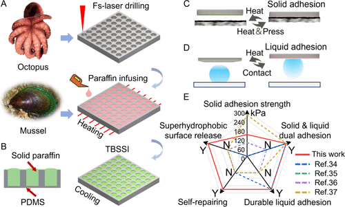 具有可切换粘附性的智能表面在可穿戴设备、机器人技术和生物检测领域引起了广泛关注。然而,在固体和液体界面上实现通用可切换粘附仍然是一项挑战。本论文在前期气液驱动的研究基础上,提出设计一种对固体和液体都具有可控粘附力的新型微纳结构界面。在合作双方的共同指导下,2022级机械专业研究生周建伟结合章鱼触须和滑腻贻贝的生物结构开展仿生设计,通过在柔软的聚二甲基硅氧烷(PDMS)薄片上进行飞秒激光钻孔并灌注相变石蜡,制备了一种热诱导仿生可切换滑腻界面(TBSSI),该界面在固体和液体上均具有强大的粘附力。该表面在室温下表现出液体粘附性,而通过焦耳热激发石蜡发生相变则可实现固体粘附性,展现出约142 kPa的强大粘附强度。机械磨损测试证明了该表面具有出色的自修复能力和优异的粘附强度保持性。