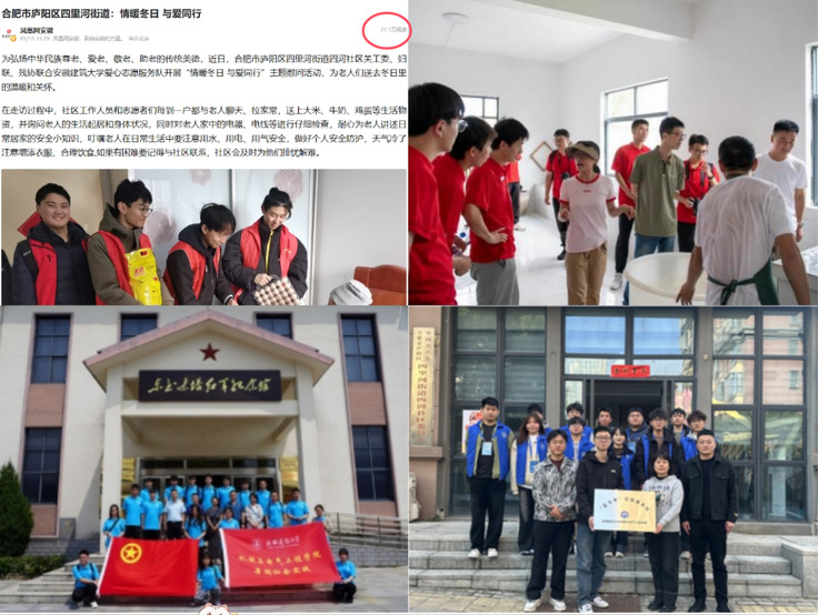推进实践育人,彰显青春奉献之姿。学院团委贯彻“奉献、友爱、互助、进步”的志愿者精神,坚持“立足校园,面向社会”两大服务方向,紧扣急愁难盼问题,围绕义务劳动、关爱老幼、义务献血、科普活动等内容开展志愿服务活动,“机电蓝马甲”已经成为学院志愿者的代名词,受到了广大同学的好评。2025年1月,学院志愿服务团队赴四河社区开展“情暖冬日,与爱同行”主题慰问活动被“凤凰新闻网”报道,单篇阅读量超27万;4月,学院“春‘锋’催奋进 ,青春志愿行”学雷锋主题教育实践活动月被安徽省学联报道。多年来,学院暑期社会实践团队以“永葆工业报国之志 探寻红色文化印记”为主题开展暑期社会实践活动,发挥专业知识特长,将红色文化与工业报国精神相结合,将一线实践与爱国主义教育相结合,相关实践活动多次被安徽省学联报道。