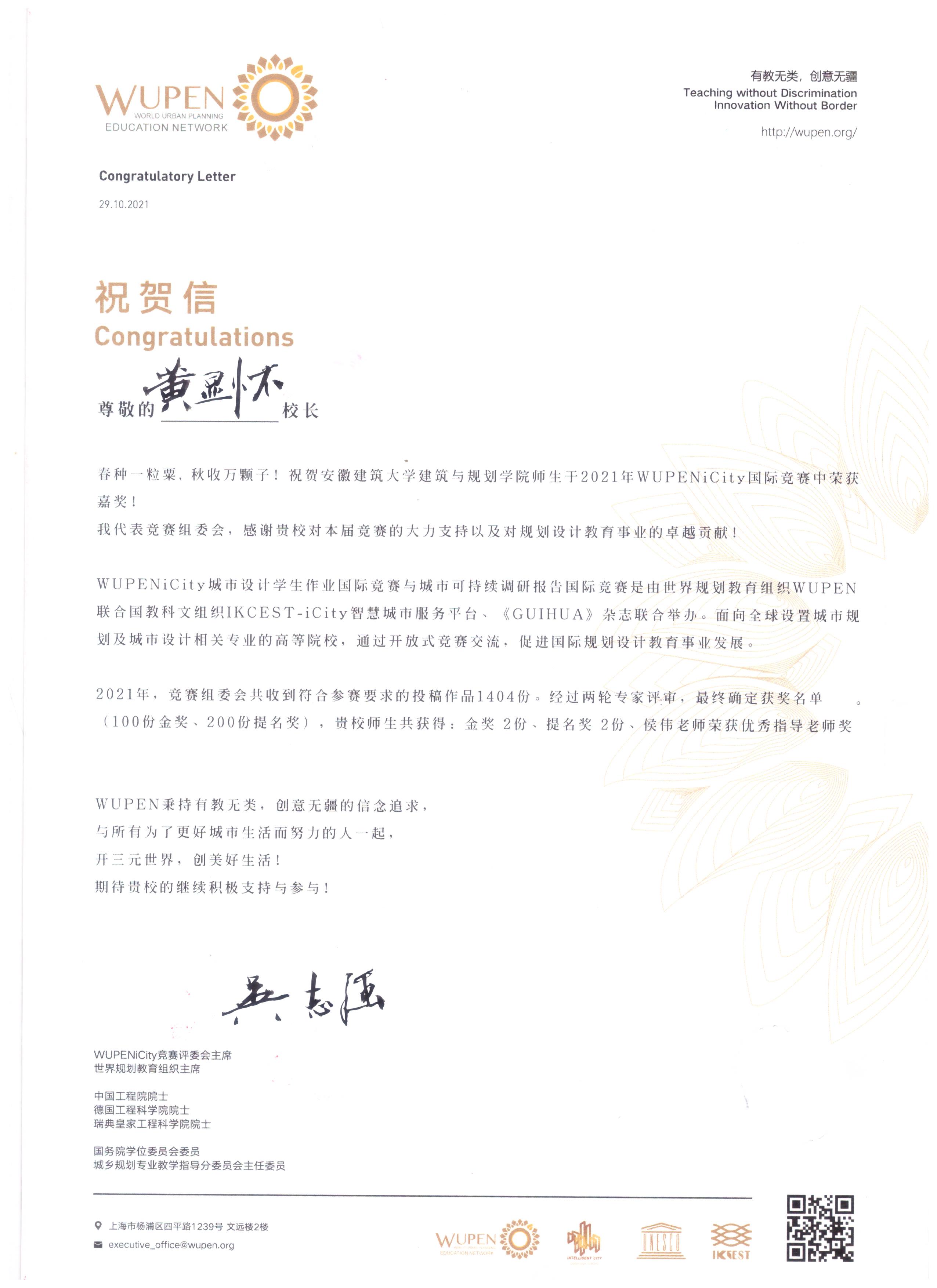 竞赛组委会予校长的贺信,不仅表达了对我院师生获奖情况的祝贺,还充分体现了对我院师生积极组织竞赛工作的肯定。传承学院优良传统,规划系历来高度重视学生专业竞赛的组织工作,坚持走出去,敢于对标国内一流院校,以专业竞赛为重要引领,不断提升本科教学水平。本次荣誉获得为城乡规划国家级一流本科专业建设起到重要支撑作用。(编辑:白贤清 汪勇政;审核:王薇)