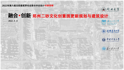 本网讯 4月8日,主题为“融合·创新——郑州二砂文化创意园更新规划与建筑设计”的2022年第六届全国五校(郑州大学、南京工业大学、安徽建筑大学、中国矿业大学、苏州科技大学)建筑学专业联合毕业设计教学中期答辩以线上形式成功举行。