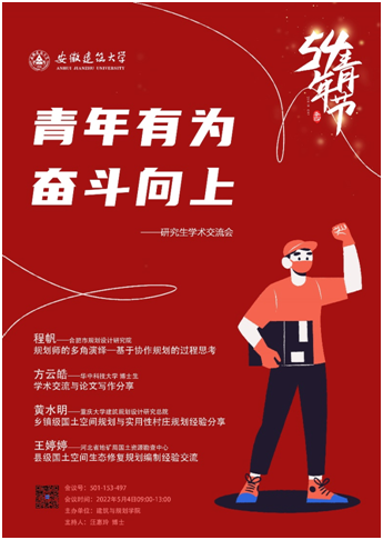 本网讯  54日上午,建规学院在实训综合楼6602会议室以线上线下结合的方式举办五四青年节研究生学术交流会,会议主题为“青年有为,奋斗向上”。交流会邀请了合肥市规划设计研究院、华中科技大学、重庆大学建筑规划设计研究总院、河北省地矿局国土资源勘查中心等单位4位青年学者,学院50多位研究生参加。