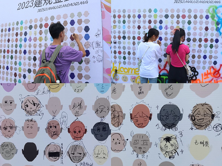 建规手绘签到墙,给新生一个展示自己特长的平台。每一个手绘的卡通形象都展示着新生丰富的想象力、无限的创造力、扎实的手绘功底。