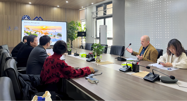 本网讯11月28日上午,建规学院召开中俄高校建筑设计作品展启动会,校党委常委、副校长闵杰出席会议,国际合作交流处、建规学院等部门负责人和俄罗斯下诺夫哥罗德国立建筑与土木工程大学Sakovich Ilia教授参会。