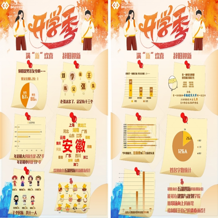 大数据时代下,从男女比例、出生年月、民族、姓氏、生源地各个方面展示2024级新生,今年有来自7个少数民族11位同学,来自18个省份及香港、澳门地区的153名新生,让他们在彼此了解下开启朝气蓬勃的大学生活。