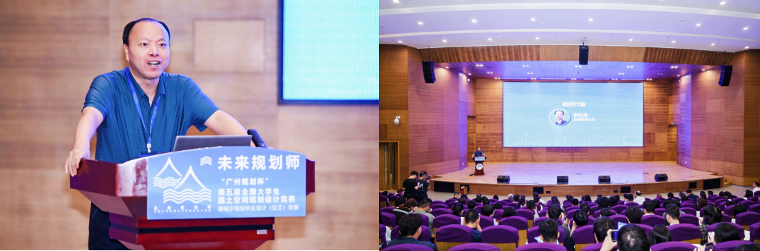 颁奖仪式结束后,我校教师李伦亮作为教师代表上台发言。他阐述了在当前经济增速放缓、房地产行业下行以及人才就业压力不断加大的复杂背景下,我校在人才培养规划中始终坚持“双主线”教育模式,即规划理论与规划实践并重的教学模式。在国土空间规划体系的框架下,学校着力强化学生的创新实践能力培养,并妥善处理科学技术进步与规划教育之间的内在关系。