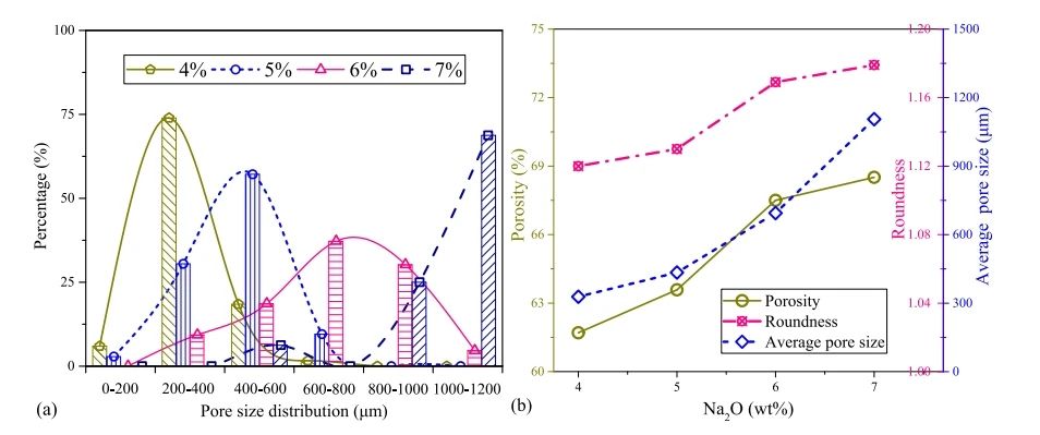 Na2O 含量对 GFC 孔隙特征的影响:a) 孔径分布;b) 孔隙率、平均孔径和圆度。