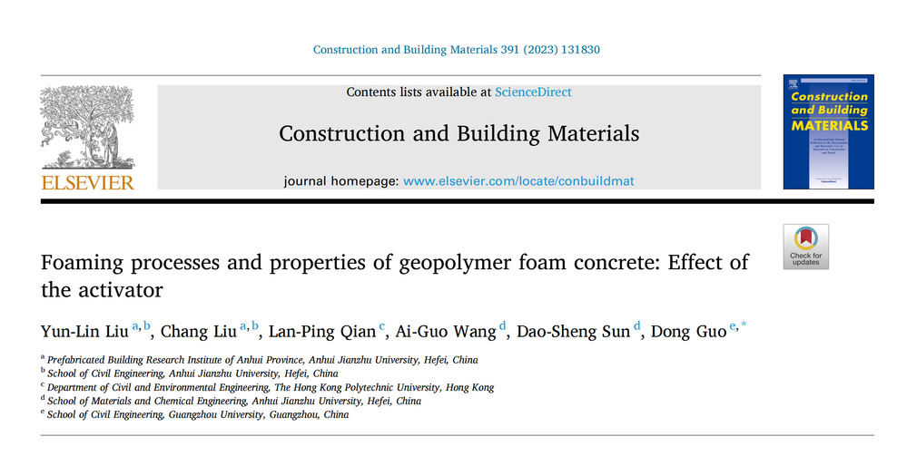 近日,我院刘运林教授团队在权威期刊《Construction and Building Materials》(中科院一区TOP期刊,2023年影响因子7.9)发表题为“Foaming processes and properties of geopolymer foam concrete: Effect of the activator”的论文。安徽省装配式建筑研究院为论文的第一完成单位。