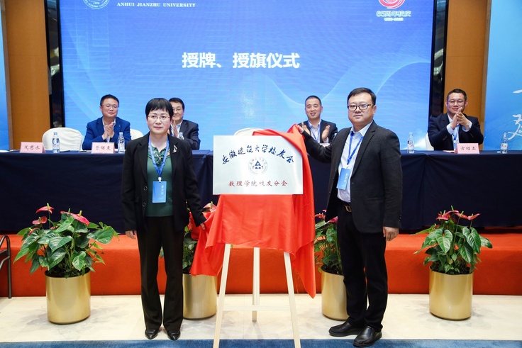 会上,王玉兰、胡燕青为数理学院校友分会揭牌,王玉兰为数理学院校友分会授旗。校友分会会长、副会长、秘书长等上台合影留念。