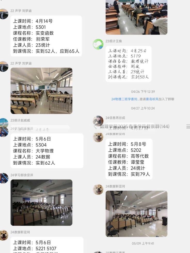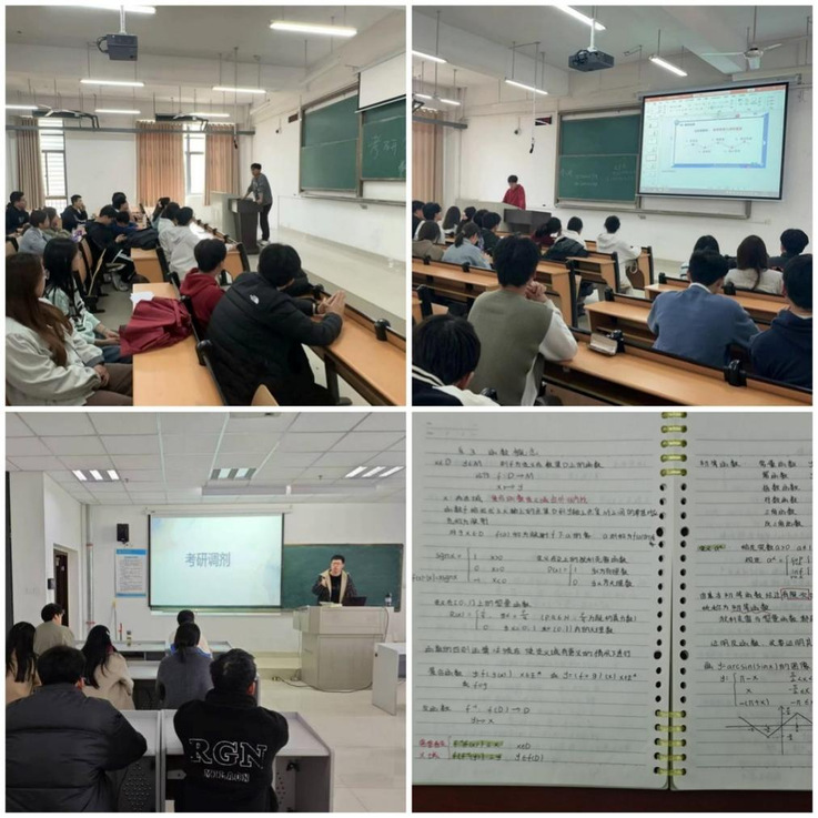 学院以促进学风建设为主线,切实推动学院学风建设精细化管理,引导学生养成良好的学习习惯。如开展学风督导严考勤,成立由学生骨干组成的“学风督查小组”,辅导员针对缺课、迟到学生进行谈心谈话,开展考研经验分享交流会、先进个人宣讲会、学霸笔记评选、2025届考研表彰暨2026届考研动员大会、“爱心送学子,情暖考研途”——数理学院为考研学子赠送“考研大礼包”、拥抱数理新家庭,共绘成长新蓝图—— 数理学院举办系列活动助力转专业学生融入新环境等活动。