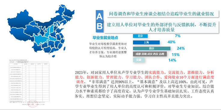 截至2024年,安徽建筑大学声学专业已为社会培养9届计531名毕业生,平均就业率保持在96%以上,声学专业毕业生对本科受教育满意度高。据毕业生培养质量的跟踪调查结果表明该专业毕业生多数就职于建筑设计院、环保企业、电子/通信/汽车巨头、AI公司、科研院所、文化机构,众多校友已成为所在单位的业务骨干和中坚力量,活跃在声学器件研发、检测及声学工程设计和咨询一线。工作单位主要分布在上海、南京、苏州、北京、武汉、合肥和深圳等城市,其中上海、南京分别占40%和24%,用人单位对毕业生专业知识、综合能力和素质都给予了高度肯定与好评。