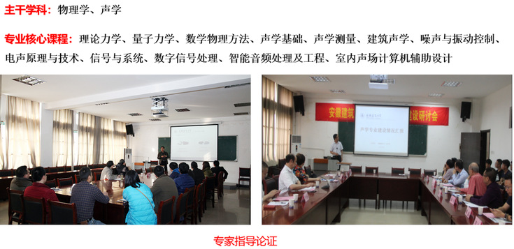 安徽建筑大学声学专业2012年首次面向全国招收本科生,2015年获批安徽省振兴计划项目支持建设,2017年获安徽省首批新工科建设项目支持,2019年获批安徽省建筑声环境重点实验室,2020年获安徽省一流专业建设点。