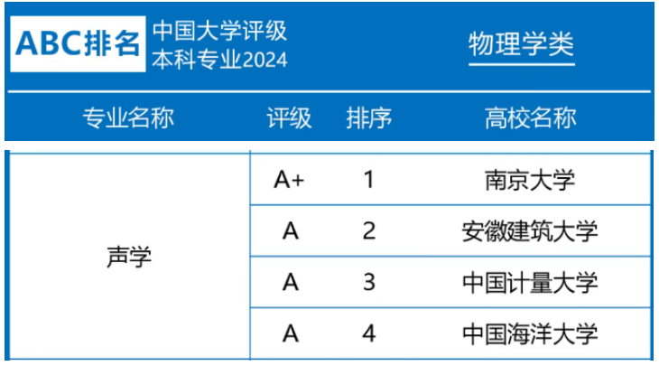 安徽建筑大学是国内第二所本科阶段开设声学专业的高校,从事建筑声学办学则是第一所。2024年ABC中国大学物理学类安徽建筑大学声学专业全国排名第2,评级为A。该专业从物理学、建筑学、电子信息技术和环境科学与工程学科交叉,走向专业融合,是培养建筑、交通、环境保护等领域声学专门人才的唯一专业。经过多年建设发展,声学专业办学特色鲜明,成为国内培养建筑声学专门人才的重要基地。中国科学院院士、华南理工大学吴硕贤院士对安徽建筑大学声学专业办学效果给予高度评价:“建筑声学是声学重要分支之一,安徽建筑大学声学(本科)专业,是安徽省一流专业,办学具有一定的特色。他们坚持办学面向社会、行业和新兴产业需求,厚基础,重实践,理工结合,所培养的建筑声学学生能胜任环境噪声控制及室内音质设计等工作。对此,我感到十分的欣慰!”