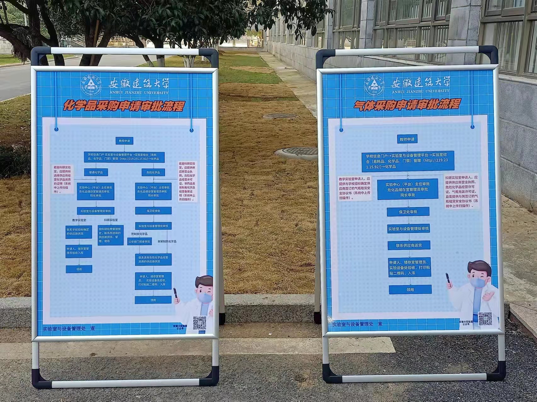 本网讯 11月-12月份,实验室与设备管理处编制化学品和气体审批流程与实验室粉尘防爆指南,分别制成展板摆放在南、北校区实验室楼宇入口,信息公开化学品和气体采购流程,宣传粉尘防爆的知识。