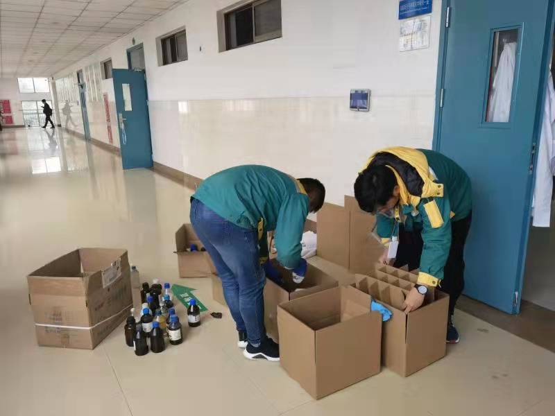 本次实验室废弃物回收处置从申报、分装到清运共历时一个月,主要涉及材料与化学工程学院、环境与能源工程学院、土木学院、数理学院实验室液态废弃物、报废试剂以及空瓶等。经现场清点、过磅,共转移处置废弃物1.06吨,其中实验室废液0.38吨,报废试剂0.5吨,空瓶0.18吨。