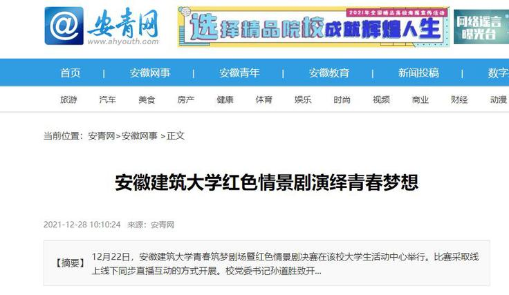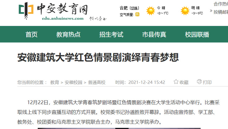编者按:12月22日,安徽建筑大学青春筑梦剧场暨红色情景剧决赛在大学生活动中心举行。12月24日,中安在线对此进行了报道,12月27日、28日,学习强国平台、安青网、安青报对此进行了转载推介。