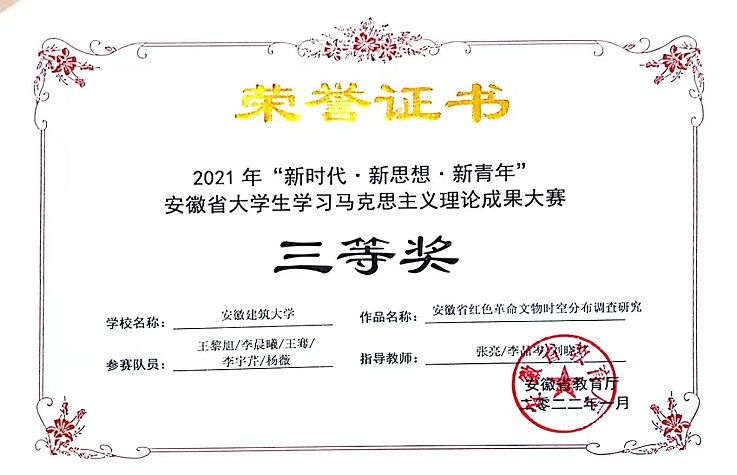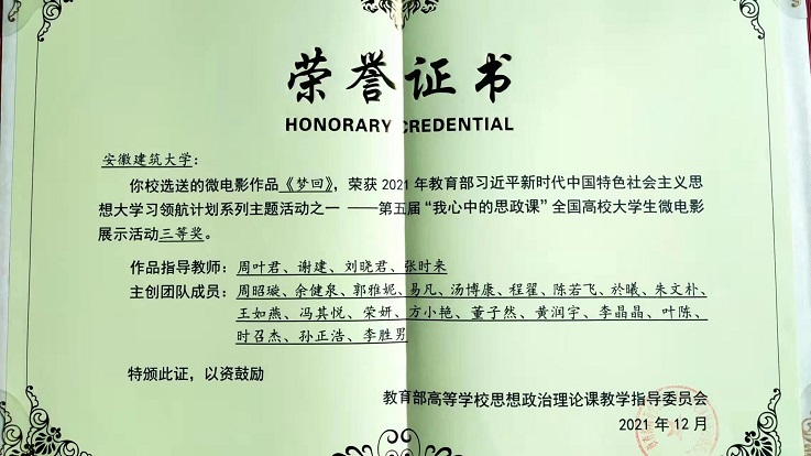 三是党建引领实践创新。根据不同课程的内容和特色,积极推进习近平新时代中国特色社会主义思想“三进”工作。精心讲好“开学第一课”,组织开展“大学生同上思政大课”,举办“四史”教育融入思政课堂教学改革创新报告会,开展“学党史”微视频创作比赛。组建教师团队赴全省各地实地调研,编纂《红色江淮光辉记忆——安徽红色建筑印迹》一书,召开新书发布会,助力红色文化和红色建筑文化研究。举办安徽建筑大学首届青春筑梦剧场暨红色情景剧比赛等庆祝建党100周年系列活动,通过历史情景剧的演绎让革命历史人物的形象立体起来,丰富了革命文化的价值内涵。以电视剧《觉醒年代》为素材创作的微电影《梦回》获教育部“全国大学生习近平新时代中国特色社会主义思想大学习领航计划系列主题活动——我心中的思政课”微电影比赛三等奖。指导学生参加安徽省大学生党史知识学习竞赛,并获二等奖。