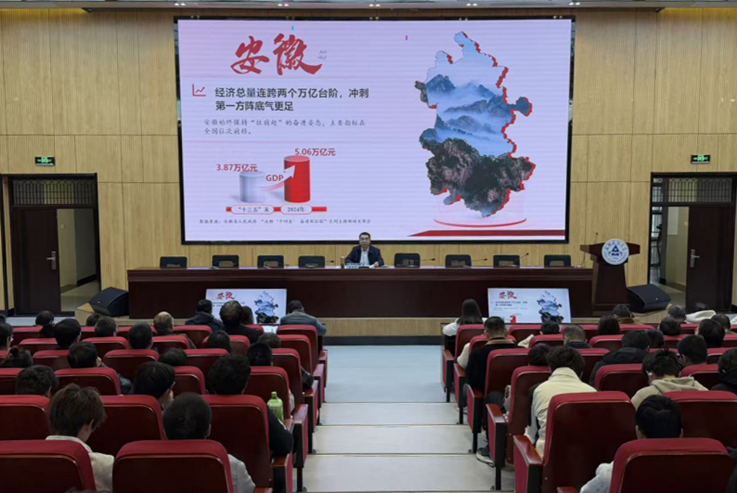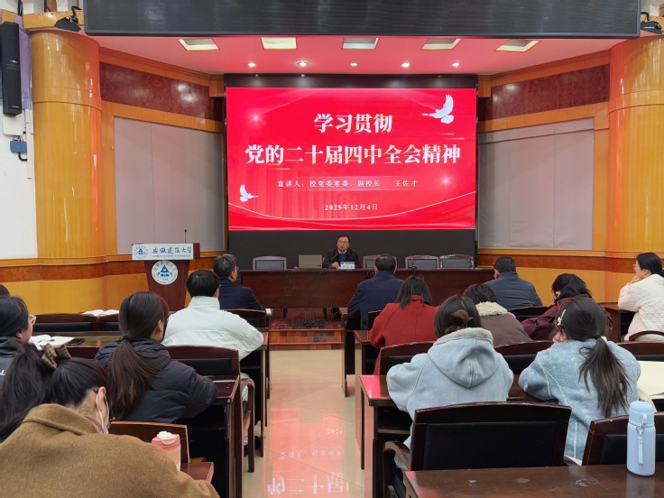 2026年1月14日,安徽建筑大学党委书记马文革在紫云路校区徽风楼报告厅,为学生代表讲授党的二十届四中全会精神。马文革指出,党的二十届四中全会是具有里程碑意义的重要会议,全会擘画的“十五五”发展蓝图为国家发展指明方向,学习贯彻全会精神是全校重大政治任务。他从六个方面系统阐释全会核心要义,结合学校办学特色分析发展机遇与挑战,强调要坚守立德树人根本任务,深化教学改革、优化学科布局、提升科创能力,在服务中国式现代化建设中彰显安建大担当。