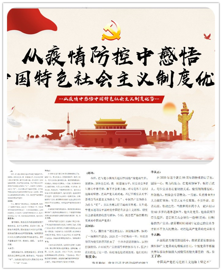 支部书记王月竹以“从疫情防控中感悟中国特色社会主义制度优势”为主题为支部党员上了一堂微党课,她主要从“党中央统一部署、协调各方;把人民群众生命健康放在第一位;全民动员、齐心协力,紧紧依靠人民抗击疫情;坚持全国一盘棋,调动各方积极抗疫;人民军队为人民,召之即来、来之能战、战之必胜;在疫情防疫中不断完善治理体系和国家制度”六个方面进行讲解。她强调,这次疫情防控彰显了坚持党集中统一领导的显著体制优势,密切联系群众的组织优势,社会主义制度集中力量办大事的显著政治优势,党对军队的绝对领导的显著优势,社会主义制度能够不断自我完善显著优势。 组织生活会上,每名党员结合亲身经历,讲述身边战疫故事,立足岗位谈切身体会,充分展示了基层党组织和党员在疫情防控、返校复学、事业发展等一系列工作中的战斗堡垒作用和先锋模范作用。张汶金说到“春节期间,我主动报名请战疫情防控工作队伍,用行动践行新时代青少年的使命担当。从早七点开始,在社区卡点,负责走访登记上传居民近十五天流动轨迹等基本信息;限制进出社区的社会车辆,以及登记社会人员信息;宣传新型冠状病毒的基本信息和预防措施,保障居民的生命财产安全。不传谣,不造谣,向社区的人民群众传播科学的防治方法,保持理性,减少恐慌,这是作为党员志愿者最基本的工作。我相信,疫情,一定会在温暖阳光中,在身体与精神的蓬勃中结束。”王志宇说到,疫情就是命令,防控就是责任。面对疫情来势汹汹,我们学生党员更要以高度的责任感和使命感,挺身而出,当好群众的“主心骨”,成为战“疫”的“先锋军”。为此我们党员要深入贯彻习近平总书记重要指示精神,吹响“冲锋号”,投身到战“疫”之中来。 支部微党课和组织生活会的顺利举行,支部党员的党性修养得到了进一步提高,坚定了理想信念,不忘初心,牢记使命,积极向优秀党员同志看齐,为祖国和人民贡献所有力量!(文/图:王月竹 徐俊;审核:胡燕青) |