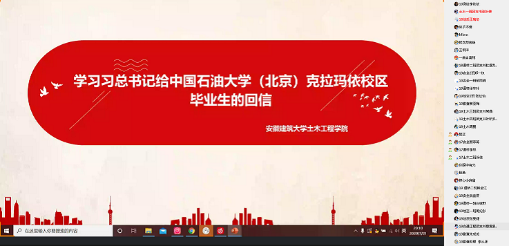 本网讯 为鼓励青年学生们勇担重任、积极上进。7月18日-7月22日,土木学院通过线上网络会议的方式,组织各班级同学学习了习近平总书记给中国石油大学(北京)克拉玛依校区毕业生的回信。同学们感触颇深,相继发表了自己的学习感悟。