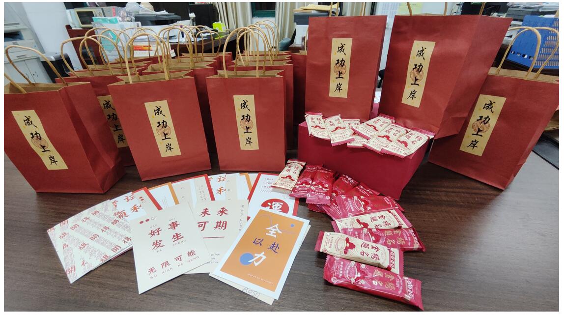 支部书记和党员代表在学生宿舍探望考研的同学,送上助力福袋”,并提醒同学们考前准备、考研时间和考试细节等注意事项。贺卡上“愿你披荆斩棘、如愿以偿”、“此战必胜”等话语承载着党支部成员们满满的祝福,定胜糖上刻的“金榜题名”也汇聚着最美好的寓意。考研路上,党支部是同学们可靠的“战友”,也是温暖的“港湾”。