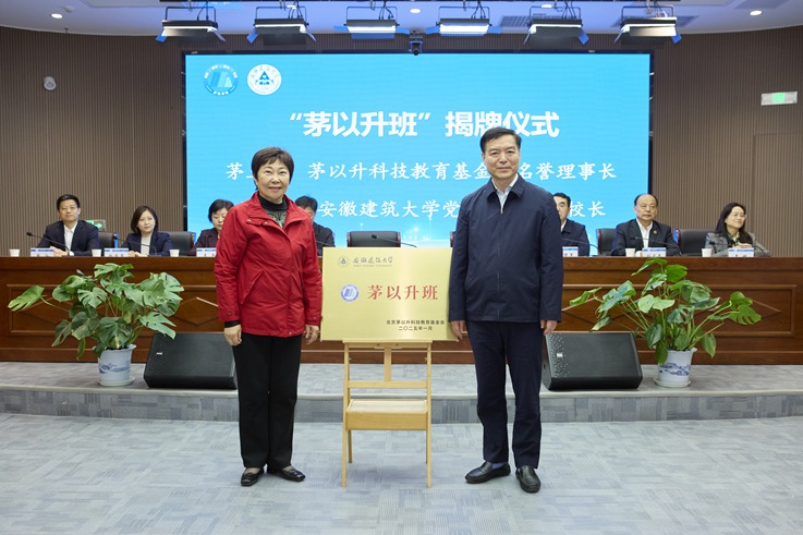 杨茜雯宣读《关于安徽建筑大学申请设立“茅以升班”的批复》函,茅玉麟与黄显怀共同为安徽建筑大学“茅以升班”揭牌。