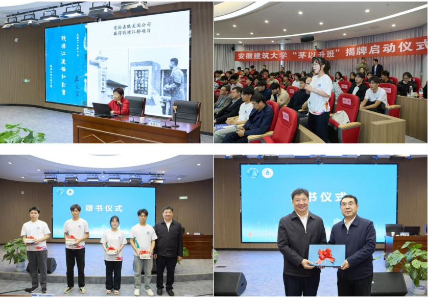 授牌仪式后,茅玉麟在主题报告《我的父亲茅以升》中,通过钱塘江大桥设计手稿、抗战时期炸桥复桥的历史影像等珍贵资料,还原了茅以升“科技报国”的一生。茅玉麟与“茅以升班”学子亲切互动,现场气氛热烈高涨,她寄语“茅以升班”学子:“先辈以匠心筑桥,你们要以智慧造桥——既造实体之桥,更造科技强国之桥”。茅为中向学生代表赠送《茅以升全集》及《茅以升工程教育思想》等书籍,鼓励学生深入学习茅以升精神与工程科技知识,不断提升自身素养与能力。蔡国军回赠安徽建筑大学元素的文创作品。