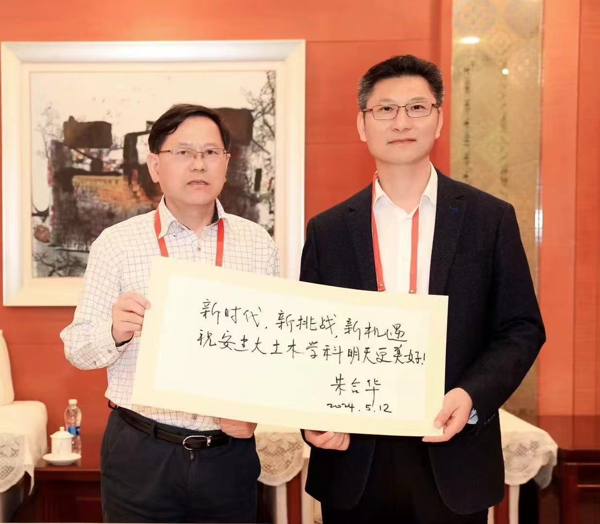 朱合华院士祝福安徽建筑大学土木学科的发展(左一:朱合华院士;右一:校党委书记马文革)