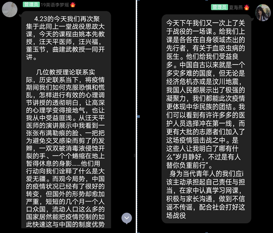 本网讯 战“疫”期间,安徽涌现出大批先进典型、凡人善举、感人故事。为充分运用好新冠肺炎疫情防控这一鲜活的爱国主义教育实践教材,4月23日,外国语学院组织辅导员和全院学生通过网络形式观看 “全省大学生同上一堂战‘疫’思政大课”,并组织各班级召开主题班会讨论。