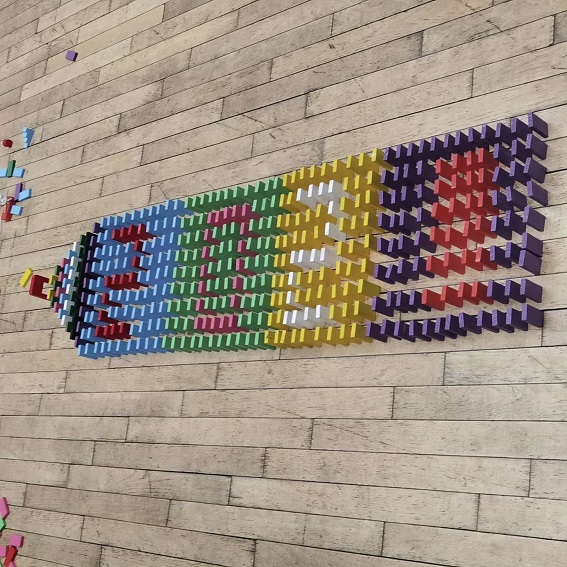 本次活动得到了同学们积极响应,参赛选手以寝室为单位,自主设计骨牌图案,在规定时间内完成堆叠工作,并就作品主题做简要阐述。活动设计极大考验了学子们的团队意识、动手能力和表达能力。比赛现场,伴着一声声清脆的骨牌碰撞声,大家或立或跪,小心翼翼对待着手中的“艺术品”。经过激烈角逐,最终4栋502寝室团队的骨牌作品以图案紧凑美观、主题鲜明、效果卓越、阐述生动获得评委一致好评,夺得一等奖。