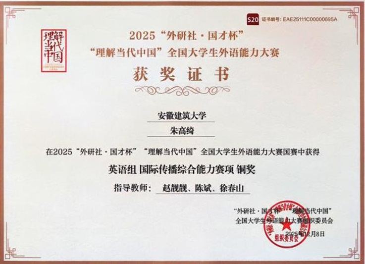 本网讯 近日,2025“外研社·国才杯”“理解当代中国”全国大学生外语能力大赛全国总决赛在北京圆满落幕。安徽建筑大学外国语学院朱高绮同学在英语组赛项中脱颖而出,获全国铜奖。