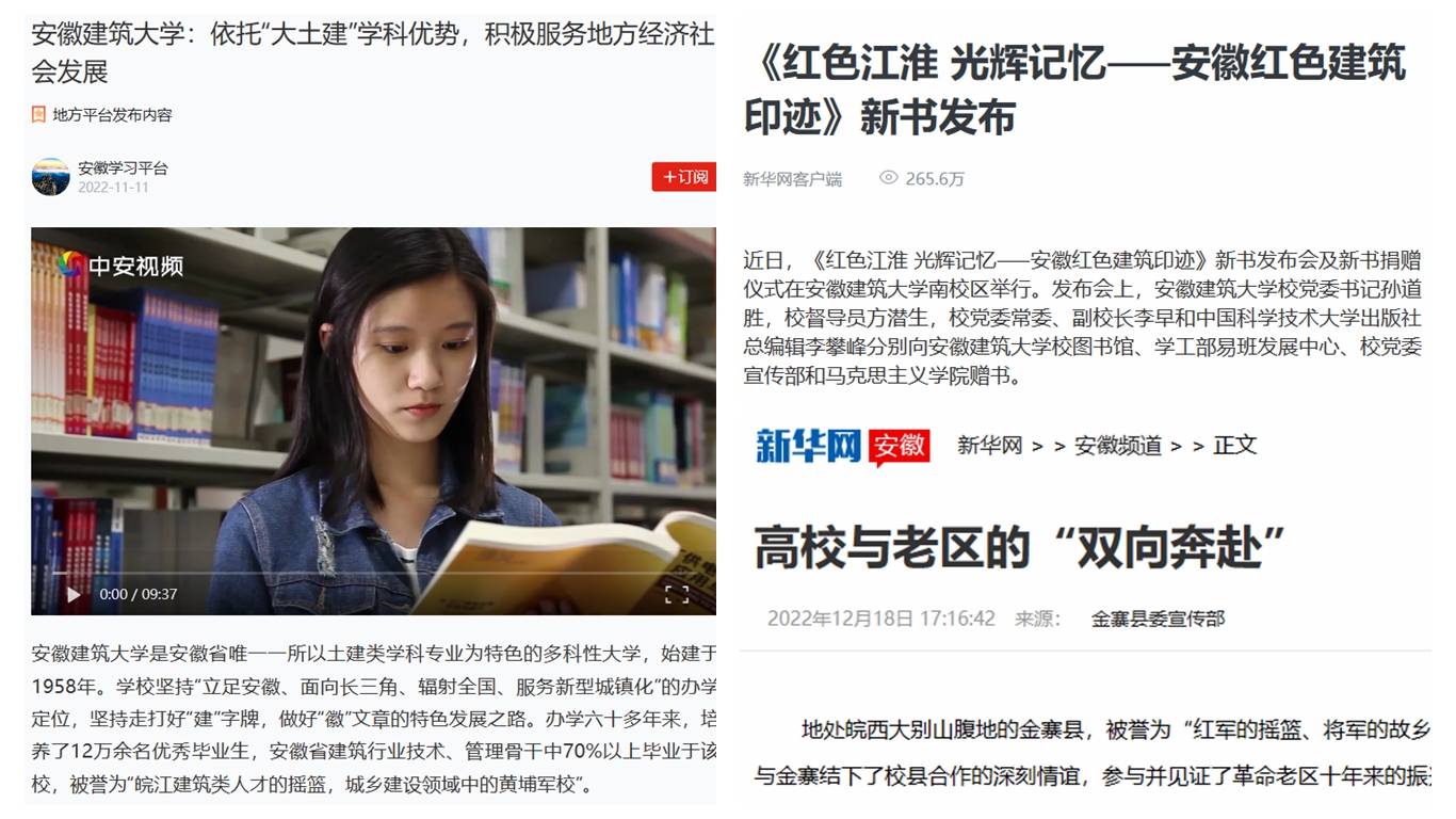 主动谋划,拓宽对外宣传影响力。在中国青年报、安徽日报、安徽青年报、合肥日报、新安晚报、学习强国、人民网、新华网、安徽青年报、中安在线等市级以上媒体发表稿件150余篇(含安徽教育网),广泛宣传学校在教学科研、立德树人、服务地方经济社会发展等方面取得的成绩和荣誉,展示学校的办学特色和担当作为。此外,开通安徽建筑大学强国号,壮大学校宣传矩阵,多角度展示学校各项工作亮点和发展成果,有力提升了学校影响力。
