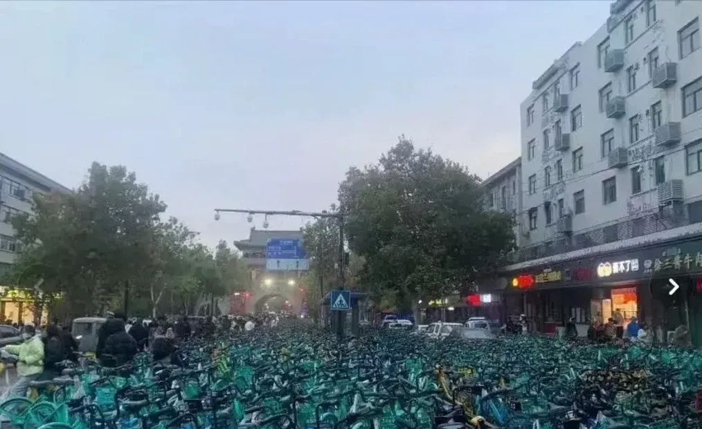 于是,成千上万的大学生纷纷效仿,一场“夜骑开封”的潮流就此兴起。到了11月8日,一个周五的晚上,骑行人数竟然达到了“10万+”。整个郑州有近七万多辆共享单车,一夜之间涌入开封。